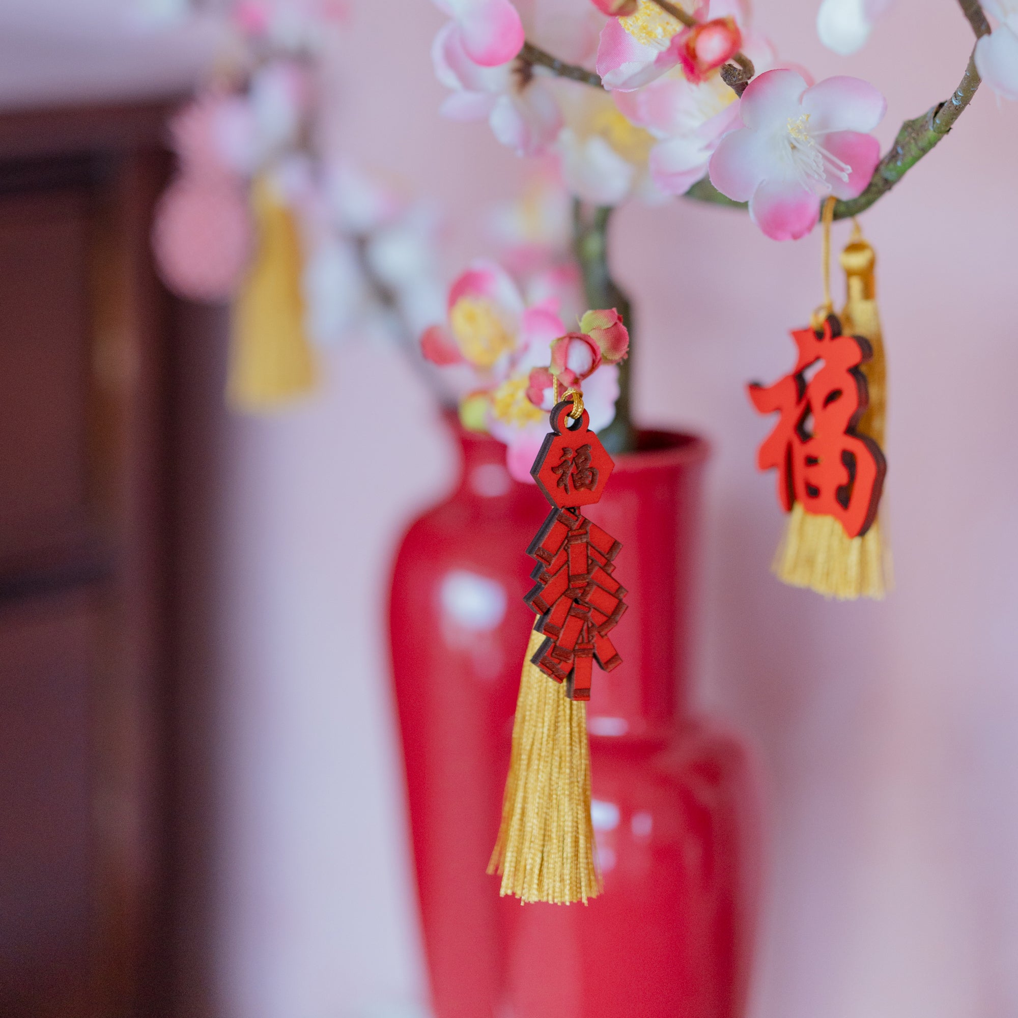 Add an extra cheer to your Chinese New Year celebrations with our decorative trinkets! This assortment of small hanging trinkets are perfect for elevating your decor this festive season. Display the small trinkets on your pussy willow branches, front door, or mantle to set a festive tone. They can also be worn as charms, bookmarks, or used as decorations on gift bags.