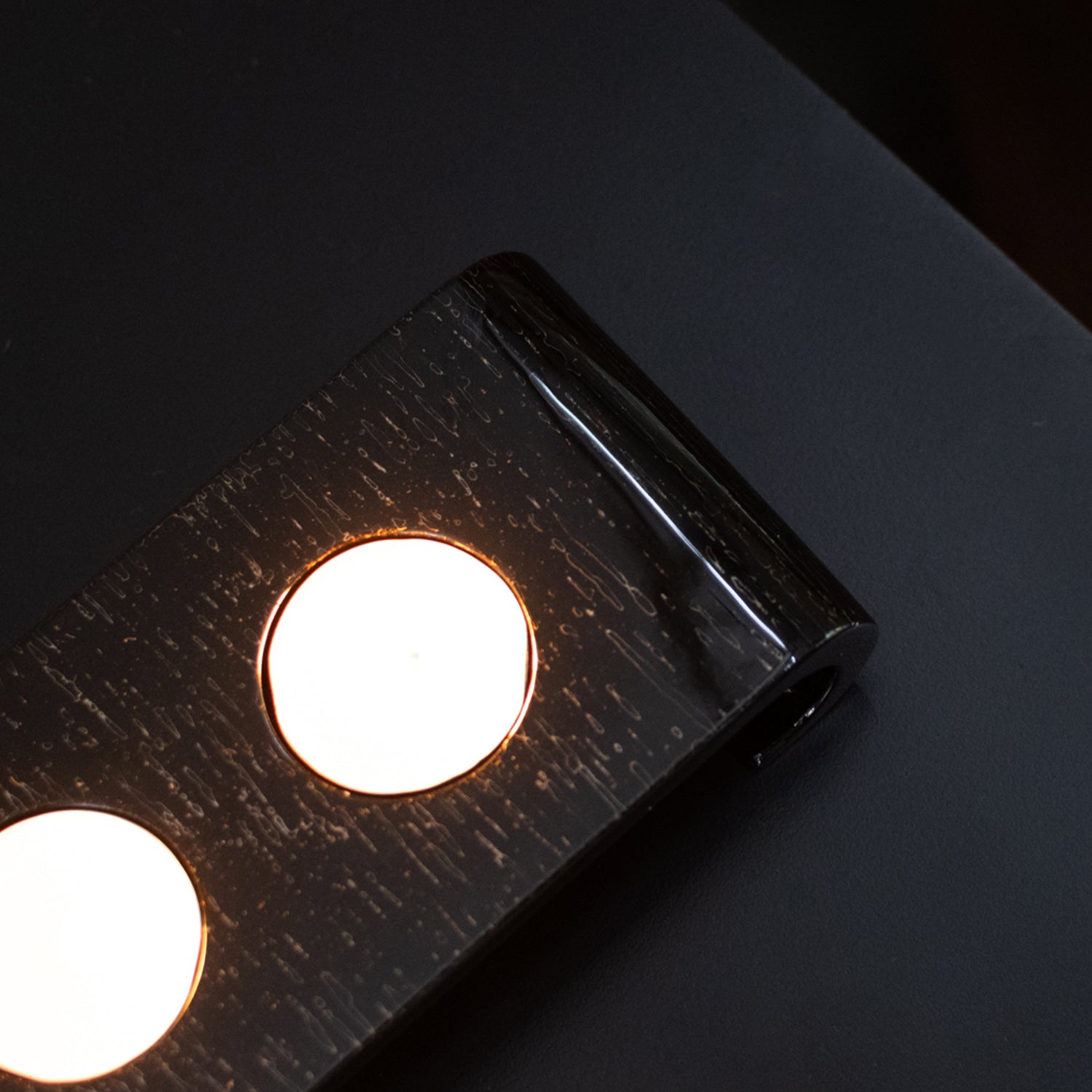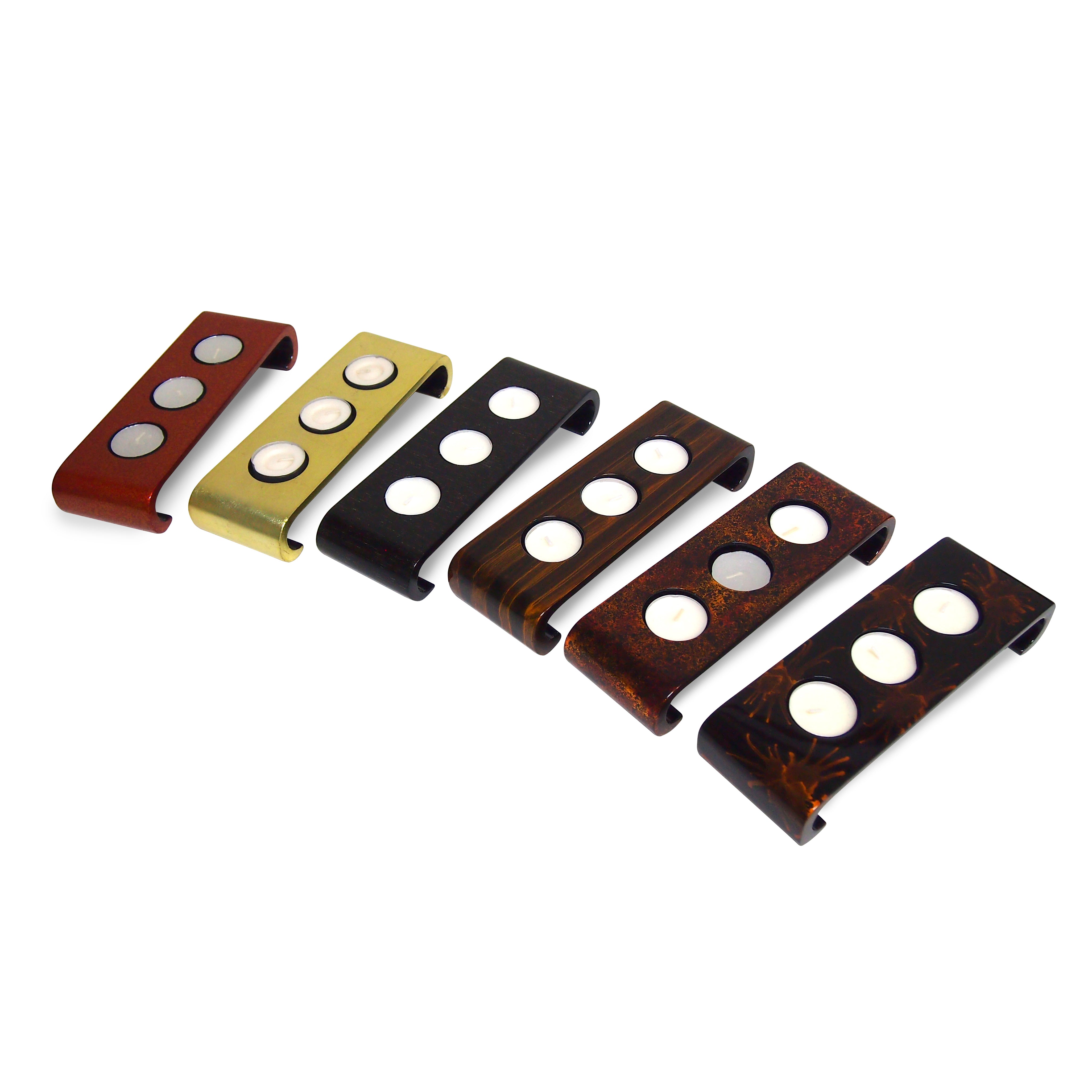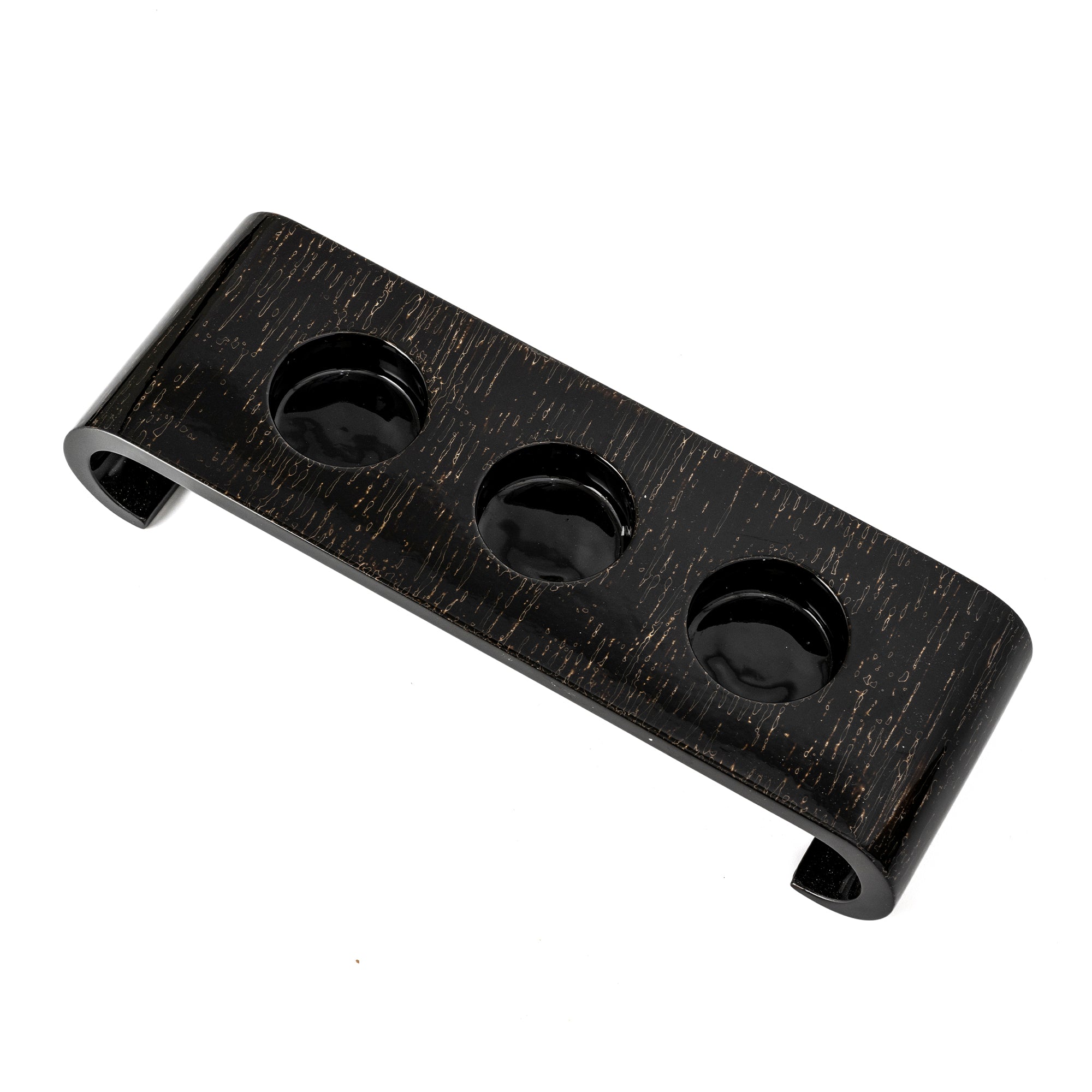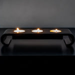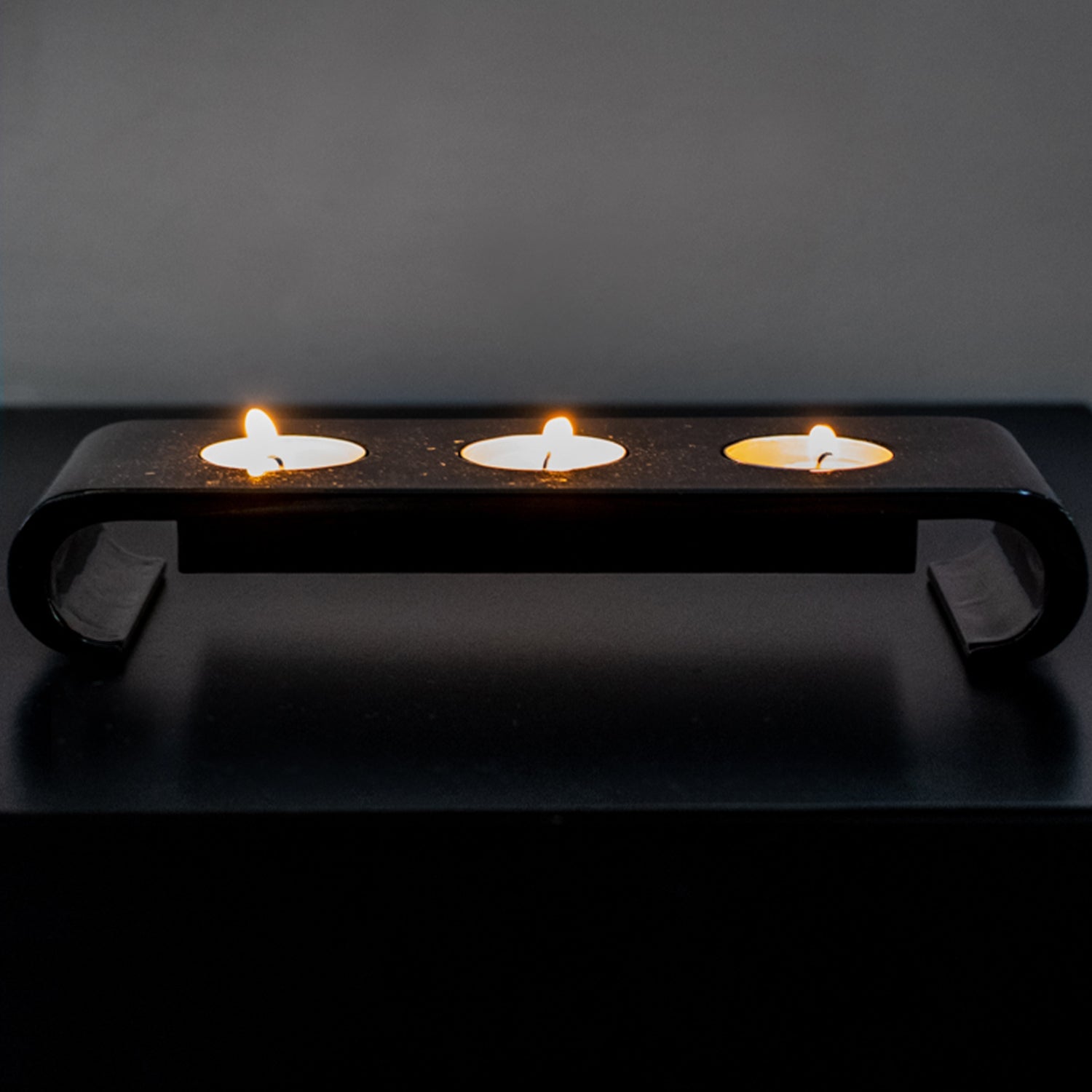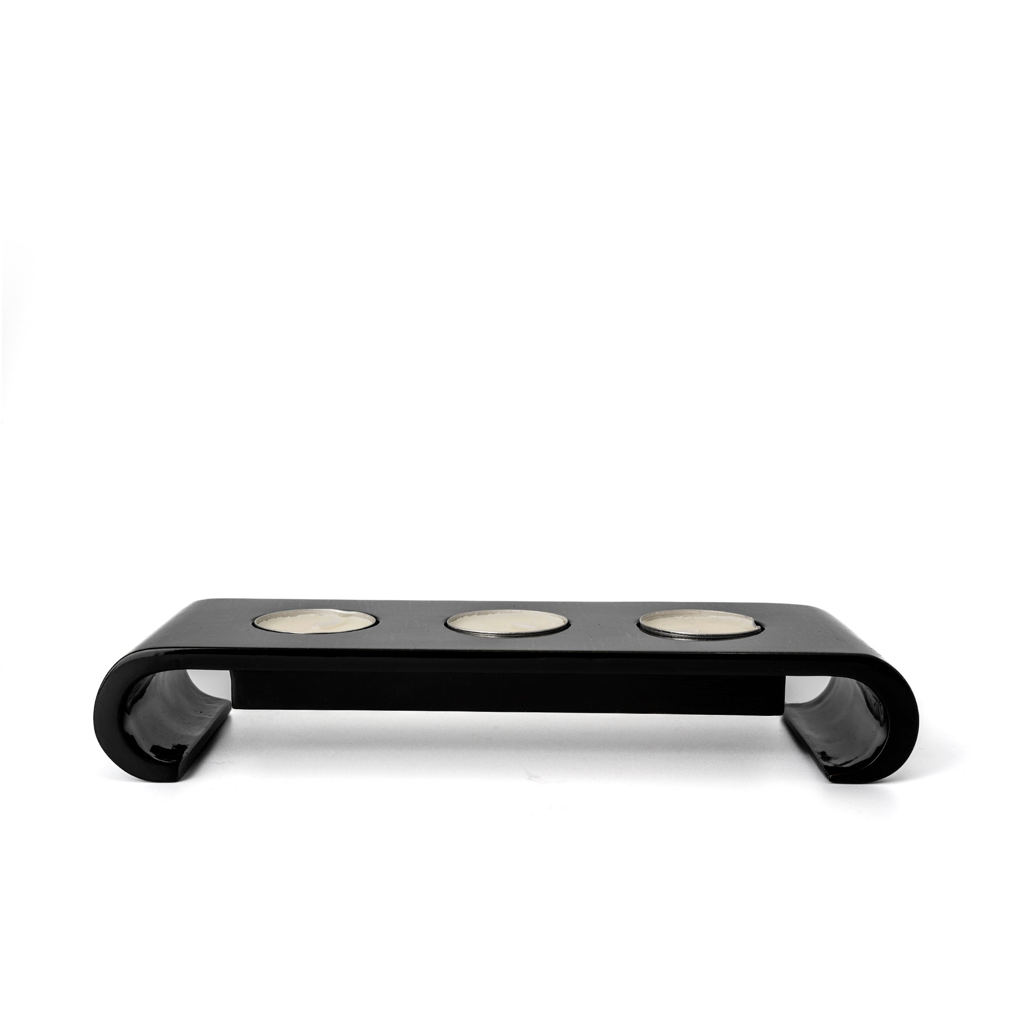 A minimalist tealight holder with a smooth, high-gloss lacquer finish.  Designed to hold 3 standard tealights, it adds a soft, reflective glow to any setting.  Available in assorted colours and design finishing.