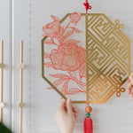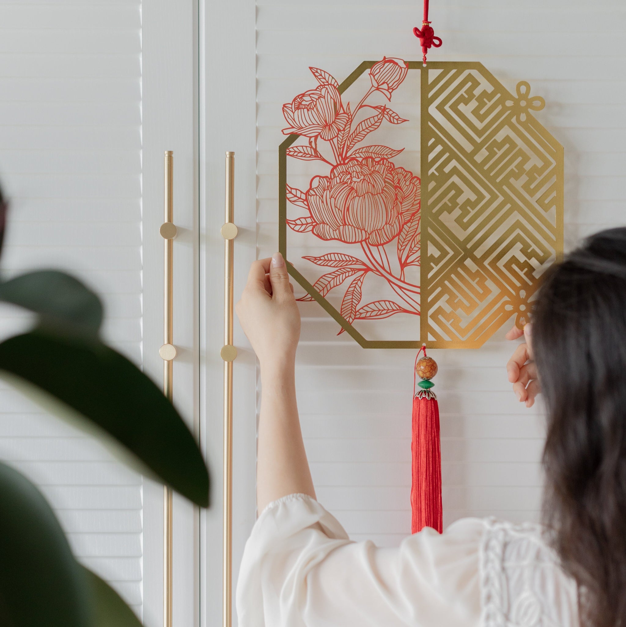 Qua presents the "Blossoms of Wealth" metal wreath. Adorned with the symbolic imagery of peonies bursting forth from a Chinese gateway. Elegantly crafted, this piece spreads wishes of prosperity. Hang it upon your doorway to bless your home with hopes that wealth and honorable fortune may bloom throughout the coming year in abundance.
