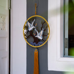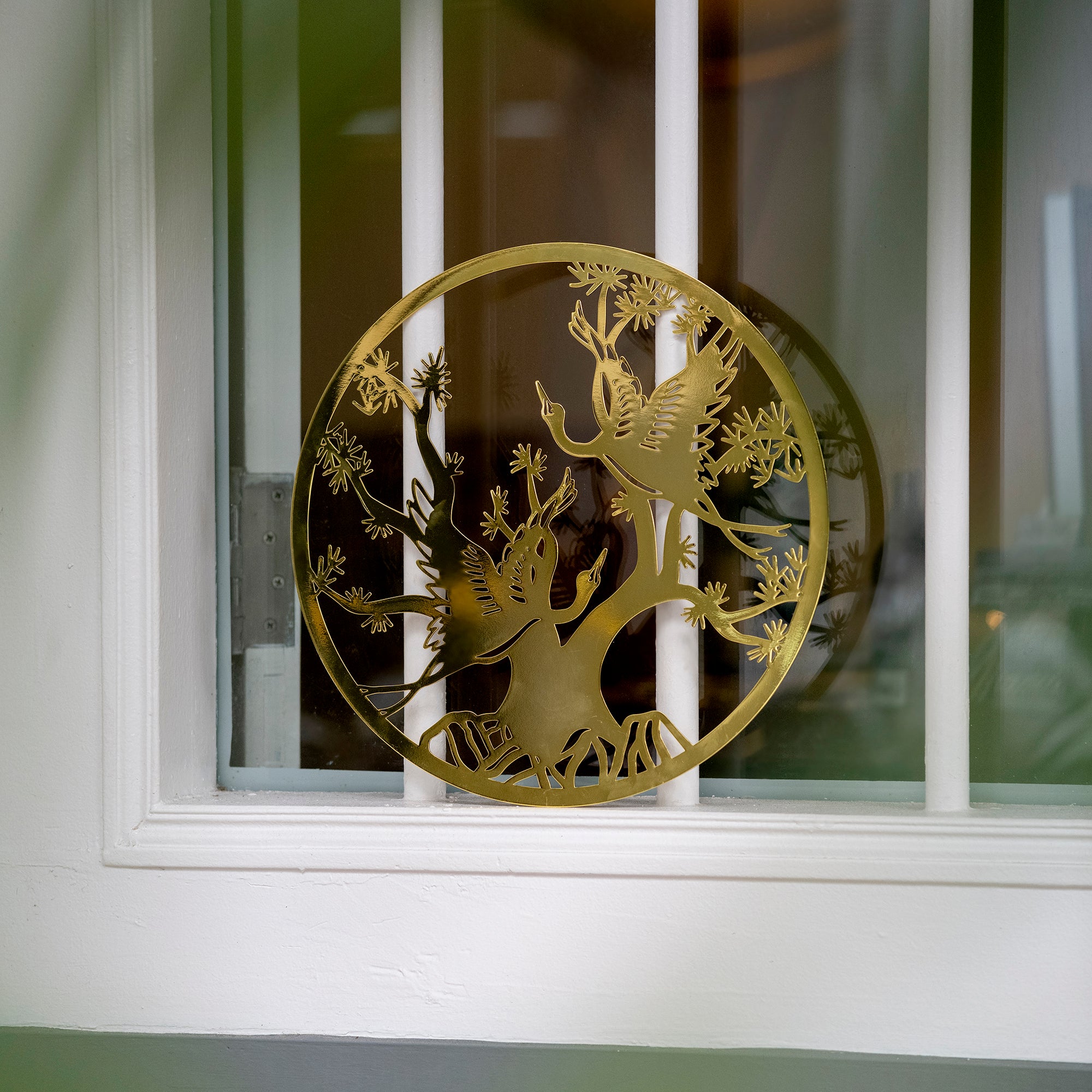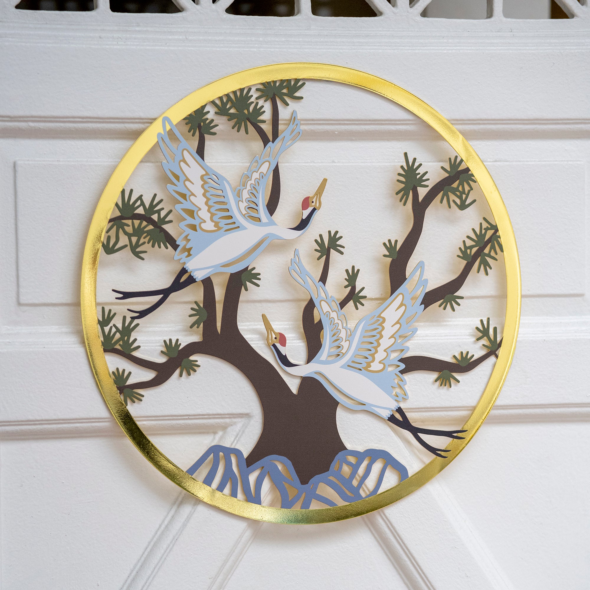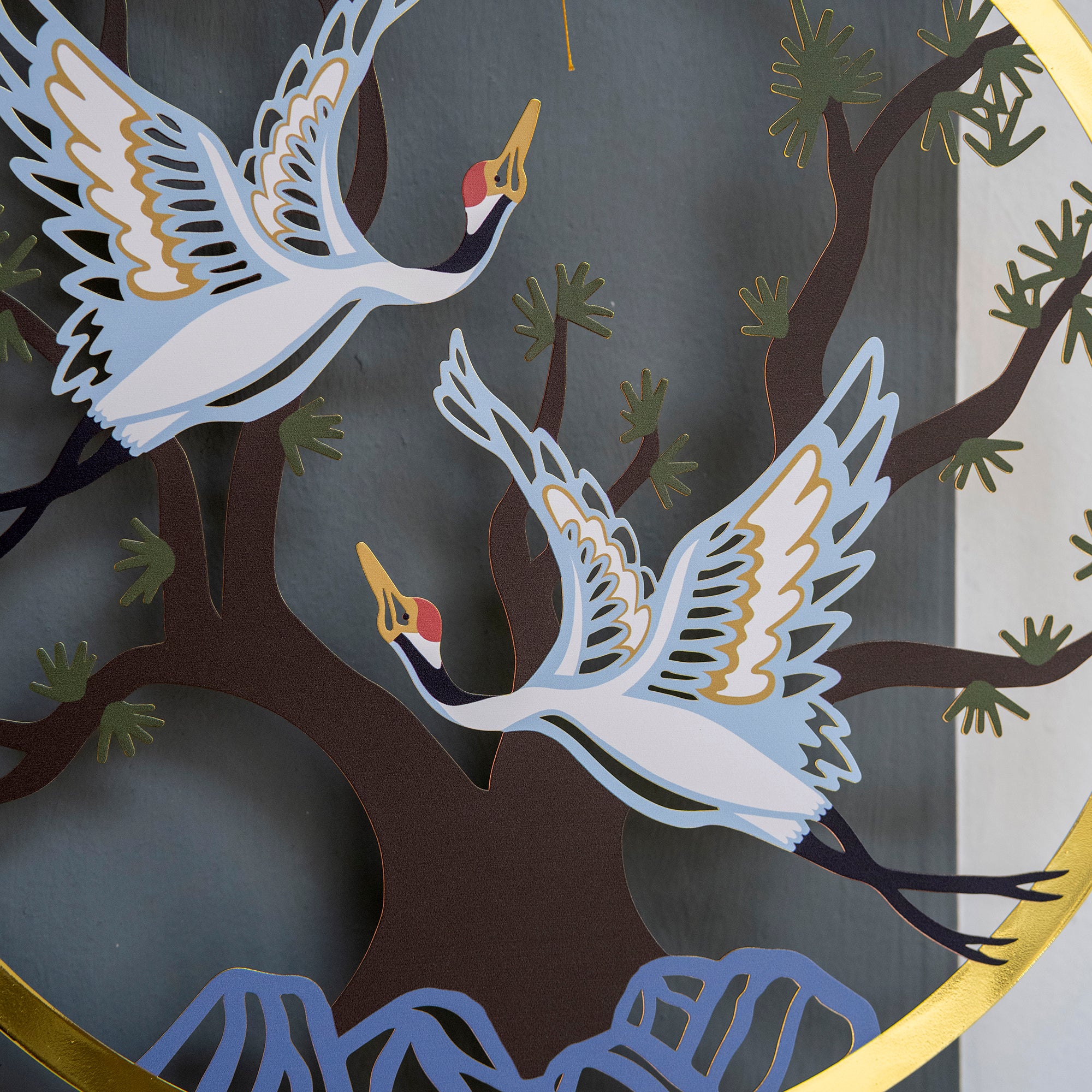 Cranes are deeply symbolic, representing longevity, peace, and harmony. This stunning piece is designed to convey these timeless values, making it an exceptional addition to any home or corporate setting. The pair of cranes symbolises strong partnerships and collaboration. In a corporate context, this reflects the company’s commitment to teamwork and harmonious relationships with clients and stakeholders. It underscores the importance of mutual success and cooperative efforts, which are vital in today’s interconnected business environment. Cranes are also associated with harmony and longevity, suggesting stability and enduring success. Can be hung in two ways — coloured or gold.